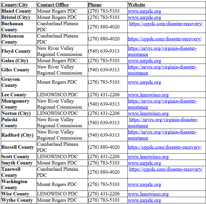 Eligible localities include Bland County, Buchanan County, Dickenson County, Floyd County, Giles County, Grayson County, Lee County, Montgomery County, Pulaski County, Russell County, Scott County, Smyth County, Tazewell County, Washington County, Wise County and Wythe County, as well as the cities of Bristol, Galax, Norton, and Radford. Funding is distributed through local governments and Planning District Commissions to ensure assistance reaches residents quickly and fairly.