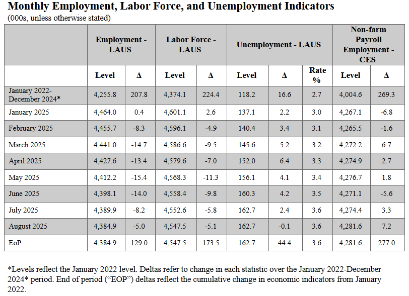 RICHMOND, VA— Governor Glenn Youngkin announced today that, according to Bureau of Labor Statistics’ Current Employment Statistics Survey (“CES”, or “the establishment survey”) preliminary estimate, Virginia’s seasonally adjusted nonfarm payroll employment increased by 7,200 jobs in August, an increase of 44,400 jobs since August 2024. Since January 2022, nonfarm payroll employment has increased by 277,000.